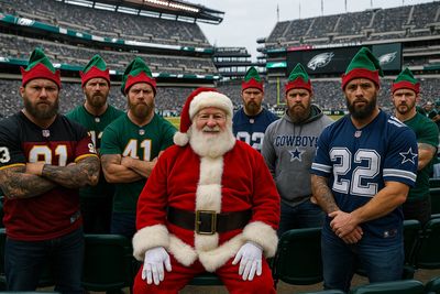 Santa, to show he wadnt fucking around, wore red and hummed "Hail to the Redskins" as if daring a confrontation. The gritty toy-shop giants, dressed in Commanders and Dallas jerseys, formed a protective wedge as Santa entered the stadium to chants of: